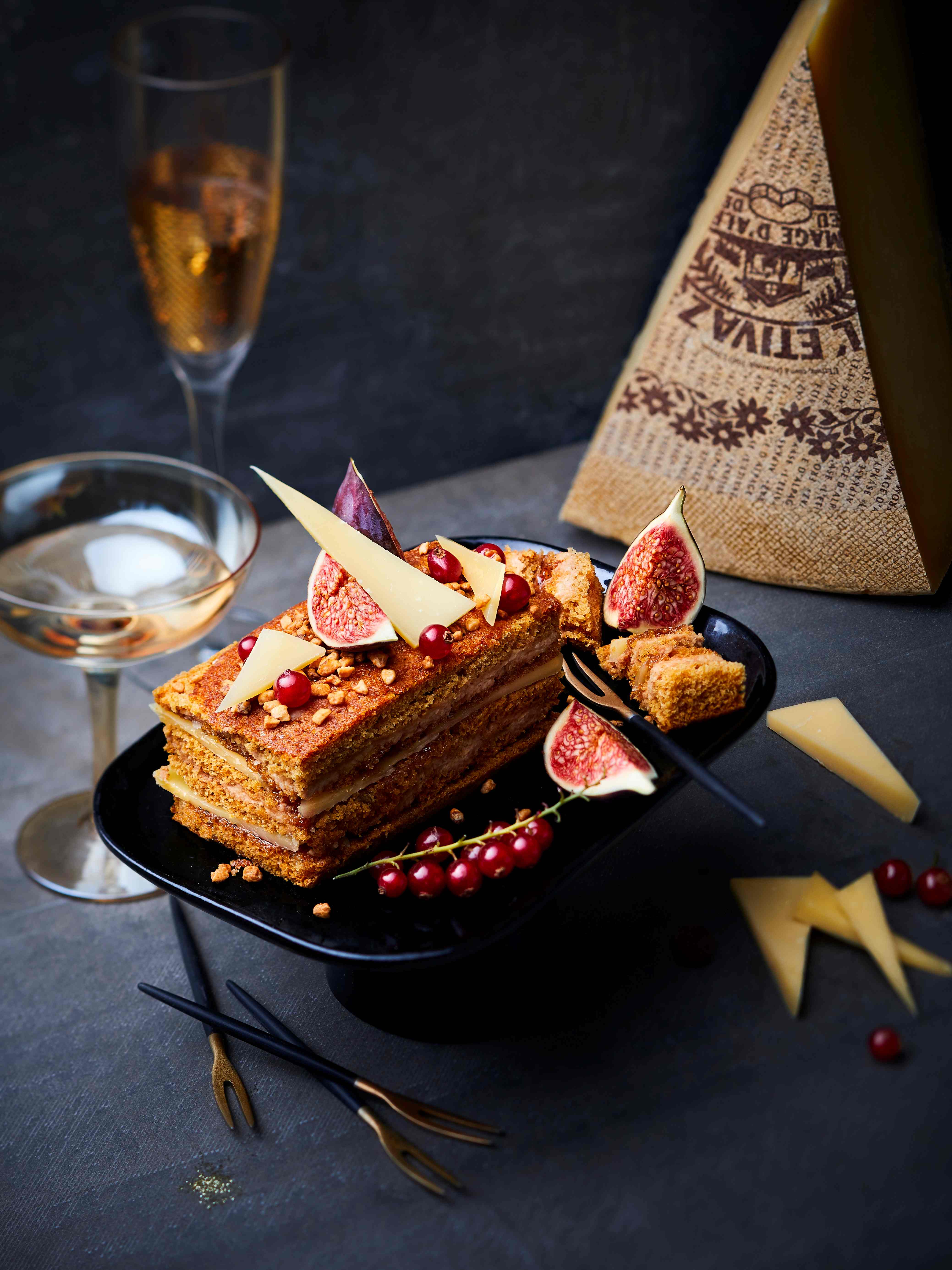 Mille-feuilles de pain d’épices, foie gras, L’Etivaz AOP et sa gelée de groseilles