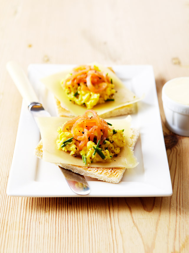 Toasts au saumon fumé, œufs brouillés et Emmentaler AOP suisse
