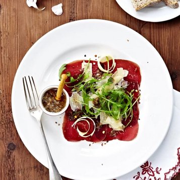 Pain aux céréales, chiffonnade de jambon cru, roquette, tomates séchées et fines tranches d’Etivaz AOP.