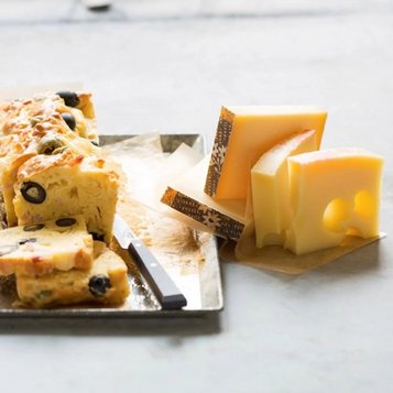 Une focaccia maison ou achetée, garnie de thym, romarin, olives noires et petits morceaux d’Etivaz AOP fondus à la cuisson. À découper en parts et à partager !