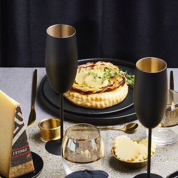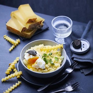 Éclats de truffe ou huile de truffe avec L’Etivaz AOP, profondeur aromatique, un mariage festif raffiné.