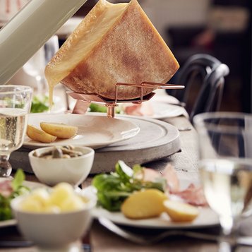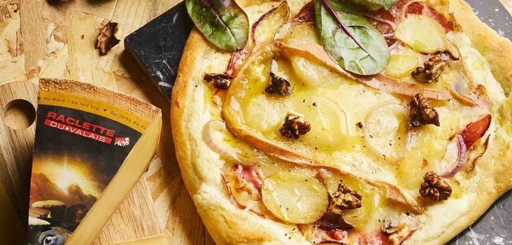 Raclette audacieuse : Pain rustique, Raclette du Valais AOP, champignons sautés, figues ou poires, épices douces.