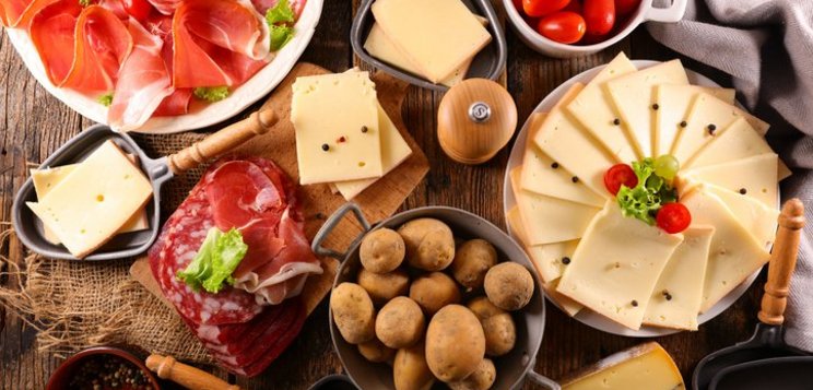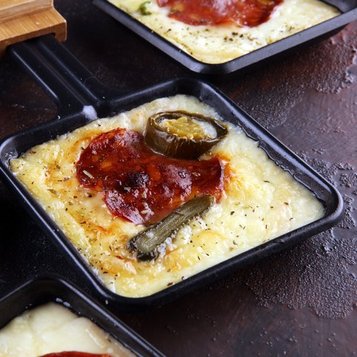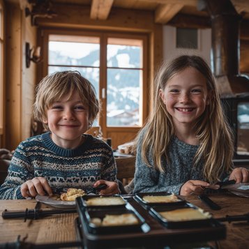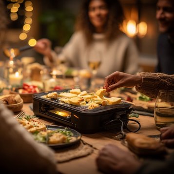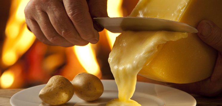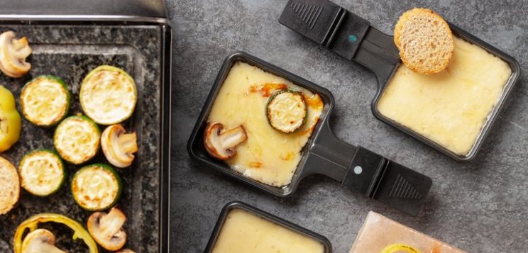 Raclette dessert ou goûter : Pain ou brioche, Raclette du Valais AOP, fruits tiédis (poire, pomme, abricot), filet de miel ou chocolat fondu.