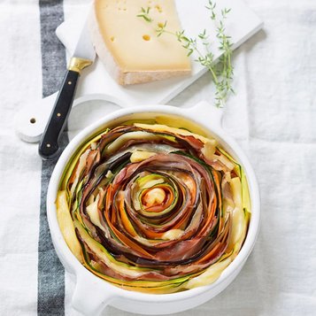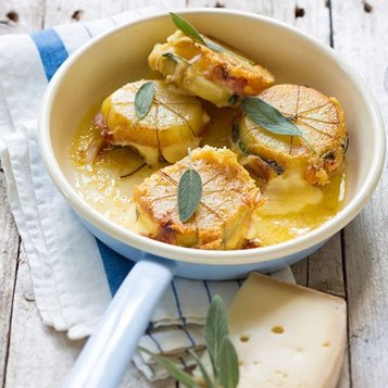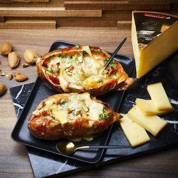 Raclette veggie alpine : Pommes de terre rôties, légumes d’hiver (courge, panais, oignons), Raclette du Valais AOP, herbes fraîches, graines toastées.