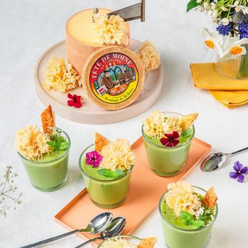 Dans des cuillères de dégustation, associez une mousse d’avocat ou un tartare de légumes à une fine Rosette de Tête de Moine AOP. Le tout se déguste en une bouchée, pleine de fraîcheur et de caractère.